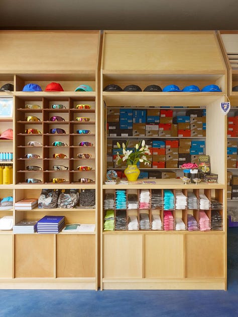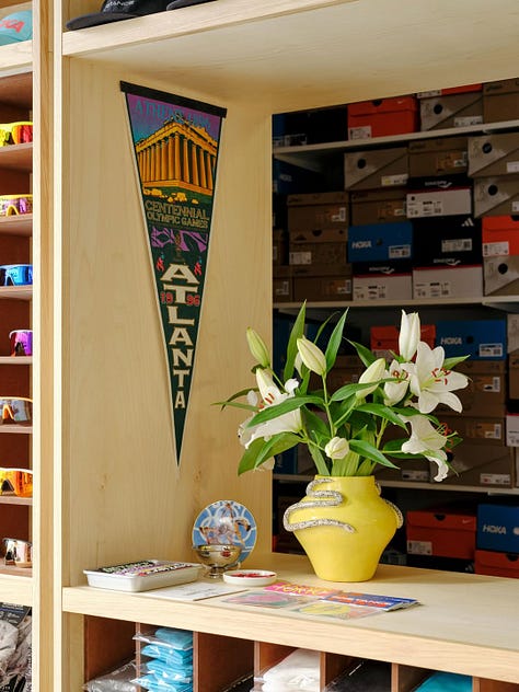 I think a lot of “cool” running stores fell into the trap of stark, cold minimalism. It’s easy to look cool when things are clean and restrained, metal, concrete and glass. The hypermodern museum-like interior has given way to warm, wood grain interiors again. Look at the trending brand stores: Bode, ALD, Ralph Lauren RRL—warm wood grain interiors tastefully decorated with tchotchkes and Americana memorabilia. Brands are creating stores you want to hang out in: listening rooms, cafes, parlors, without actually making . While these stores need to look cool, they want to be approachable, and arguably need to be.