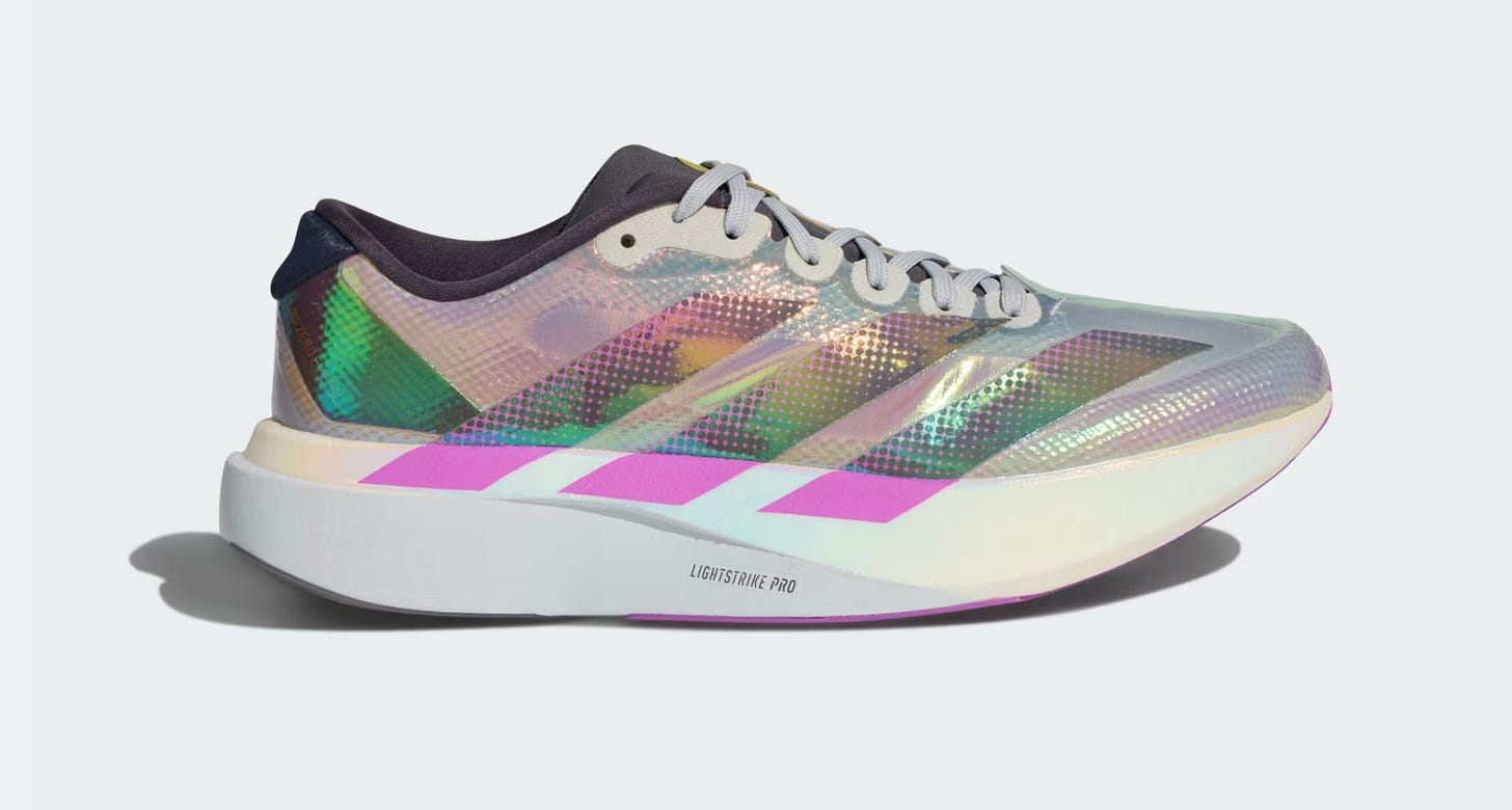 While that is an option…so are these beauties. After adi applied all the same colorways from their Originals (Samba, etc) line to the EVO SL, I got tired pretty quickly. HOWEVER, these are different. Crazy iridescent effect on these. These look fast and like they’re from the future. This Adizero EVO SL WOVEN also has TPU overlays on a new woven upper for better lock down and breathability.