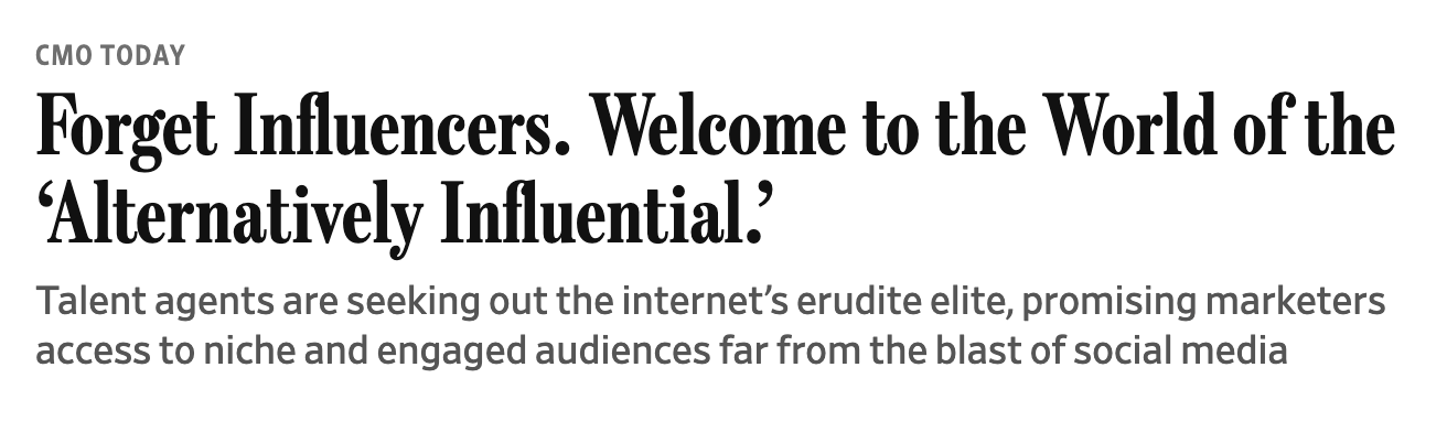Welcome engaged readers of my niche newsletter. Quoting the WSJ here, which ran an article about the “alternatively influential,” i.e. someone that’s moving the needle and shaping a market without hocking GRWM1 videos online nor Instagram Reel ads for major brands.